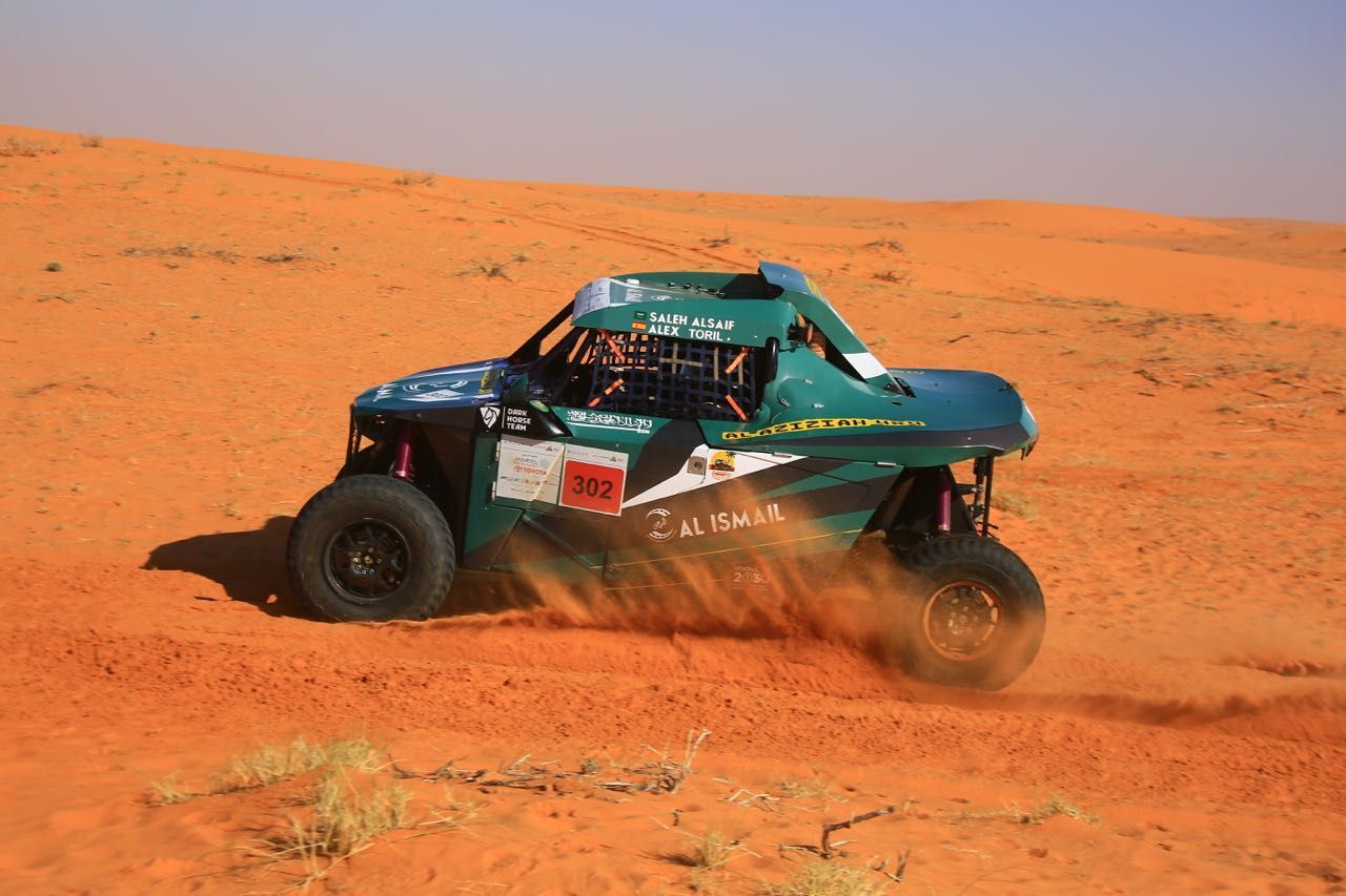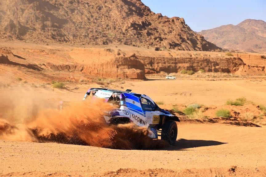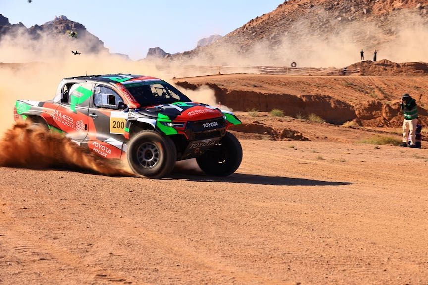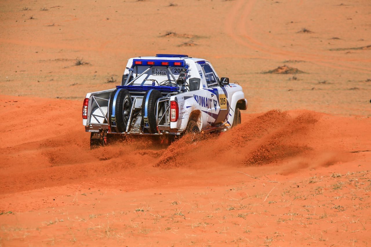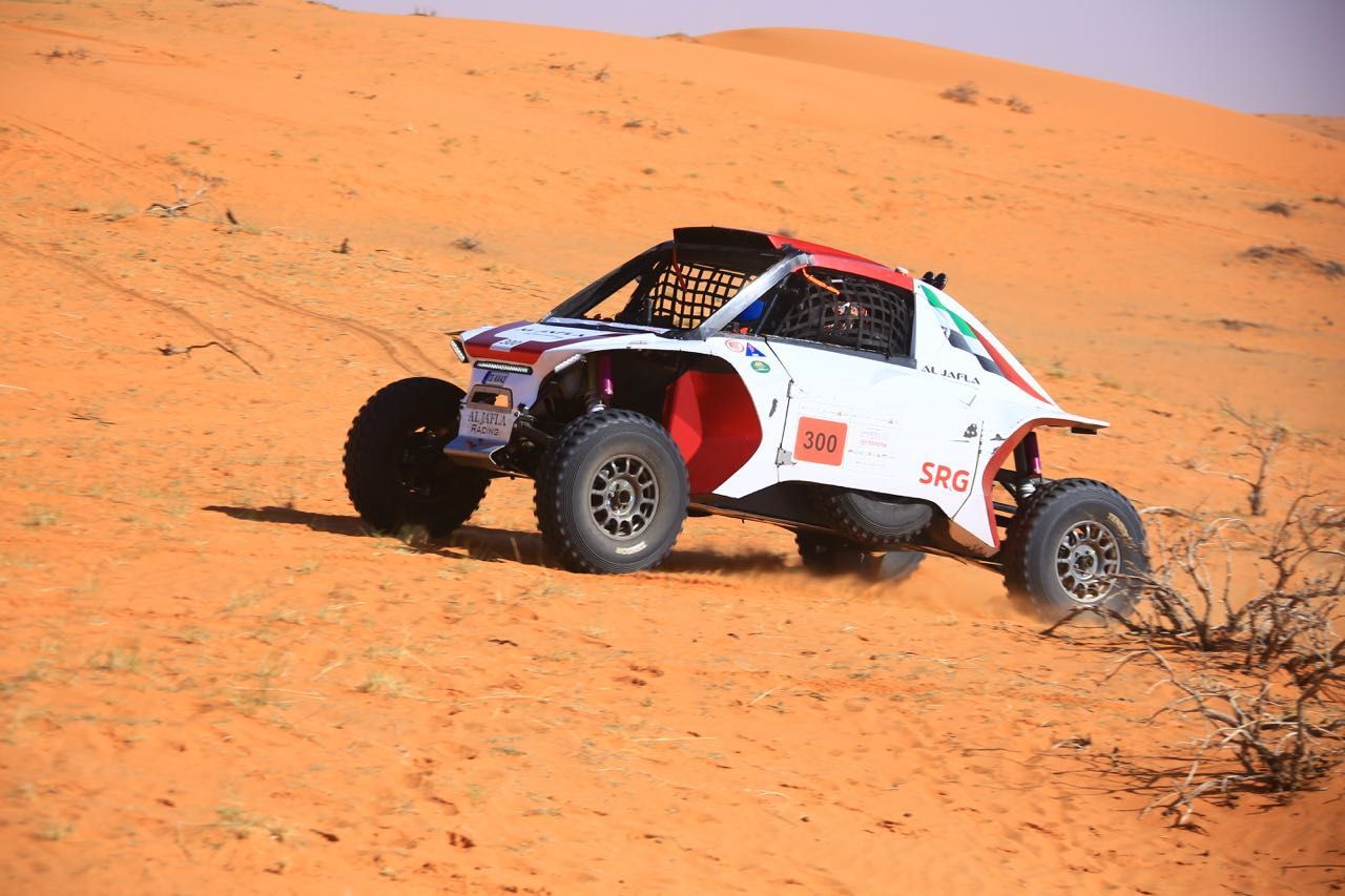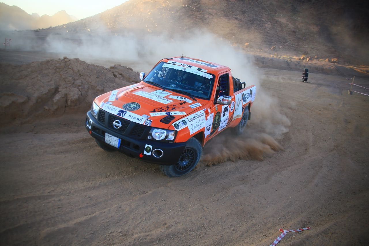 Il percorso di gara era davvero molto bello, grazie anche ad un deserto freddo e più compatto del solito per la tanta pioggia. Quindi dopo le verifiche tecniche ed amministrativi gli equipaggi in gara hanno affrontato un prologo di 8km ricavato in un’area montagnosa molto suggestiva, poco distante dal quartier generale al campus universitario di Hail. Dopodichè due giornate di gara con la prima tappa di un totale di 459 km di cui 260 di prova cronometrata. Dalla partenza un plateau di piste dure e tanta erba cammello sul tracciato, qui la navigazione era davvero fondamentale per poter trovare tutti i waypoint e non prendere penalità. Il secondo giorno aveva sempre un primo trasferimento mattutino di 153km, per arrivare sempre allo stesso punto dello start della prova cronometrata; ma in questo caso la prova era lunga ben 163km e giungeva esattamente nello stesso punto di fine prova del giorno precedente. Quindi le dune da affrontare erano diverse e la navigazione altrettanto complessa.