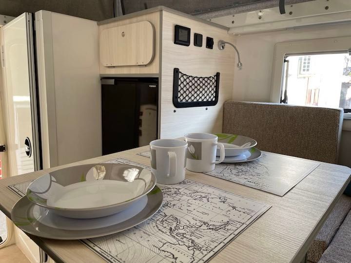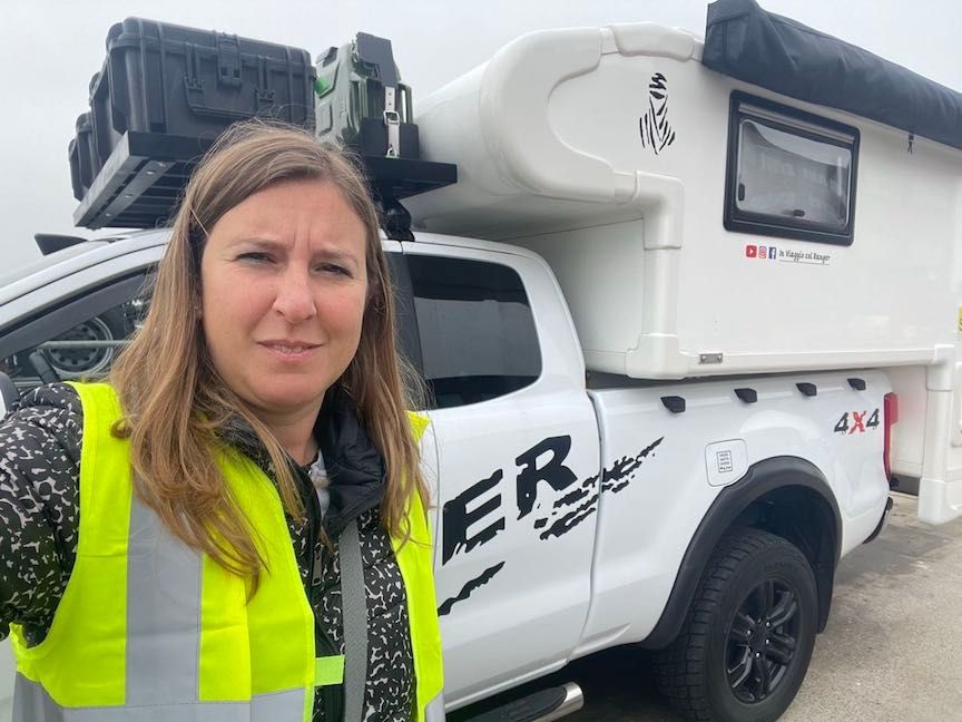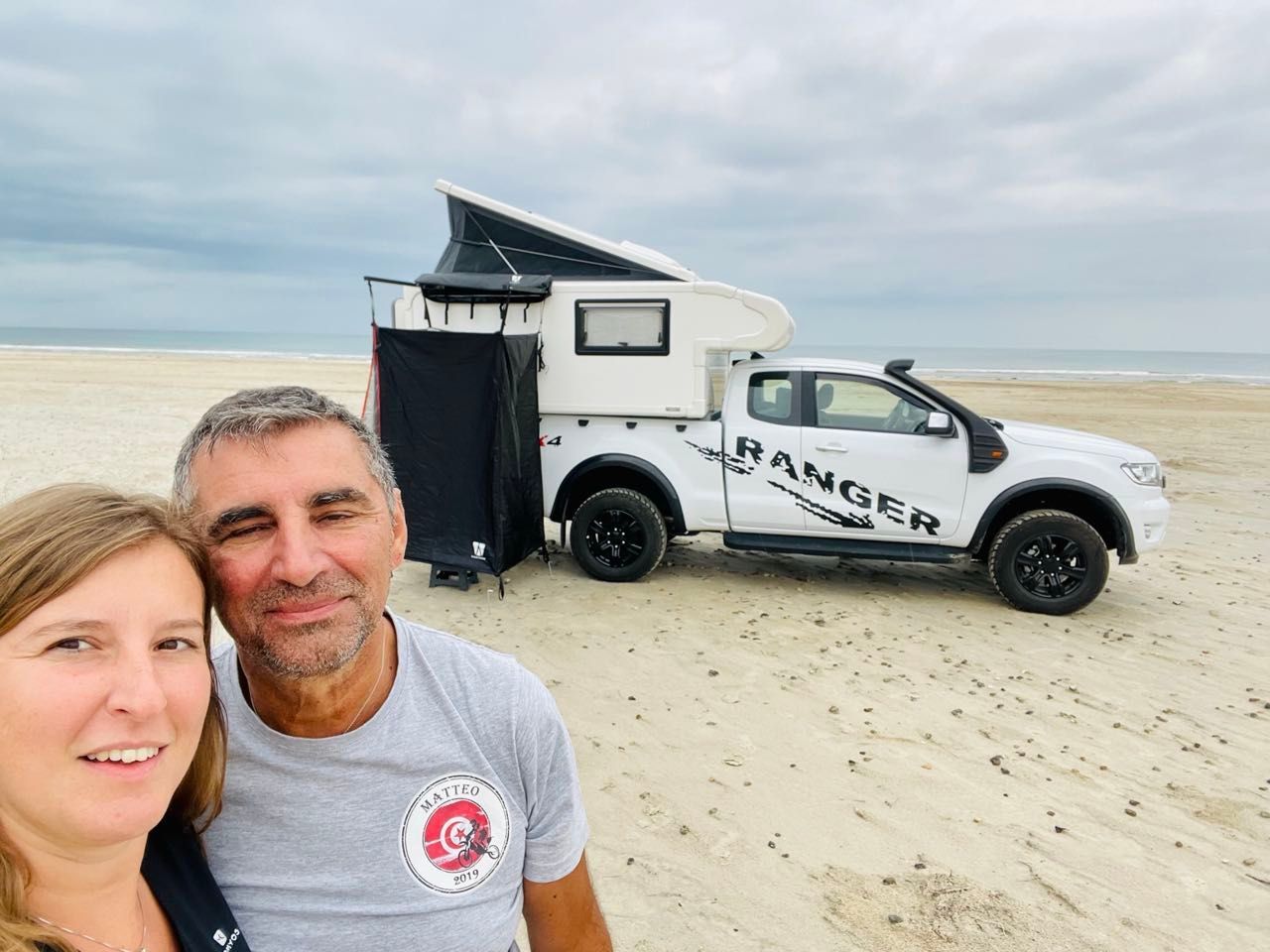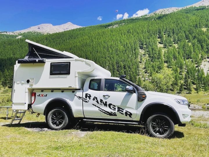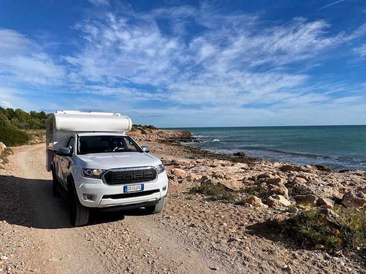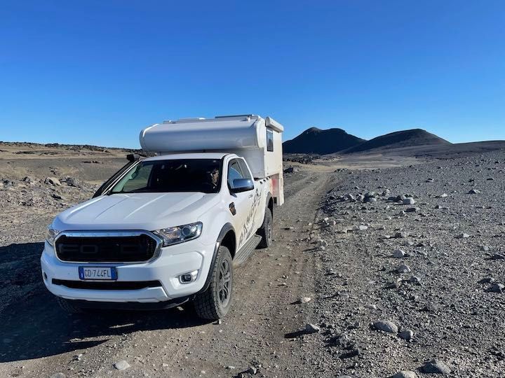Il nostro mezzo è un pick-up Ford Ranger, acquistato in Italia nel 2021, con una cellula abitativa costruita da Modulidea (un costruttore che ha sede a Fidenza), realizzata su nostro disegno e completamente attrezzata per essere un camper in miniatura e permetterci di vivere in qualsiasi condizione climatica.