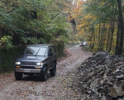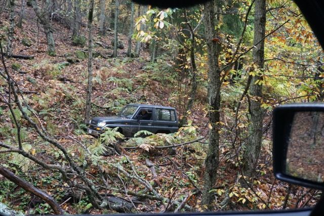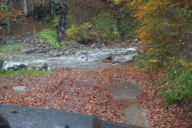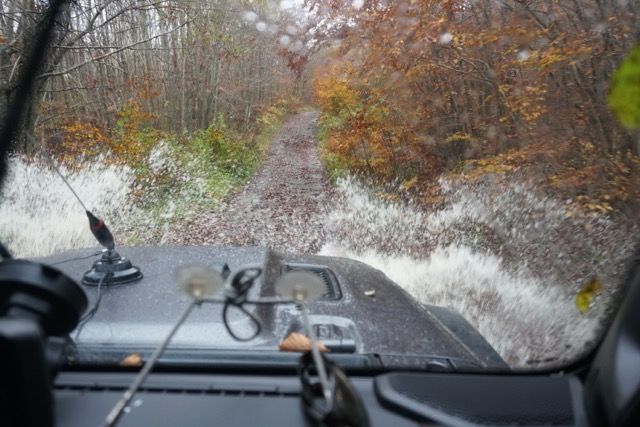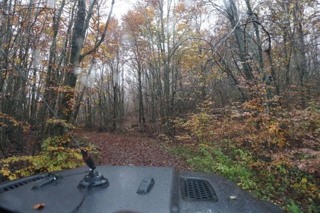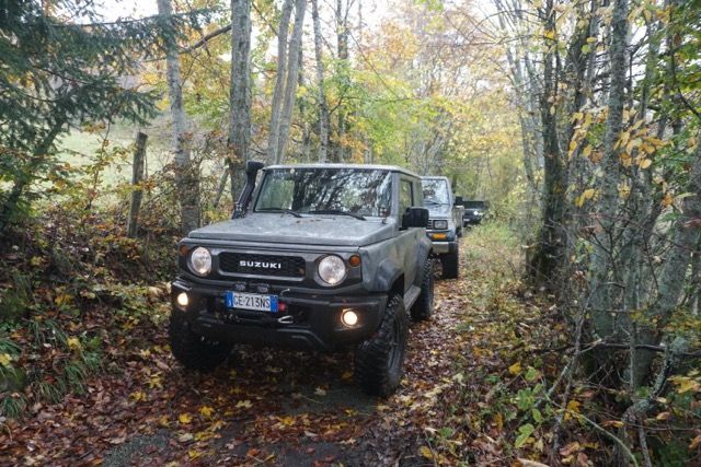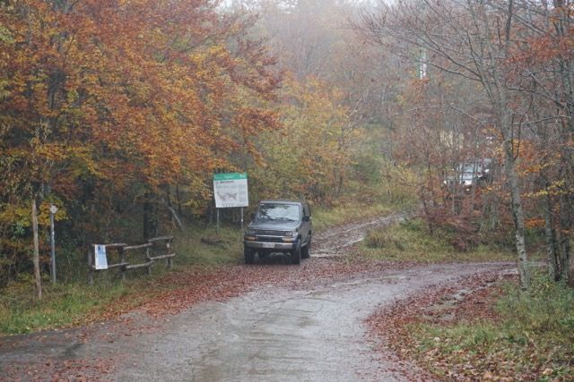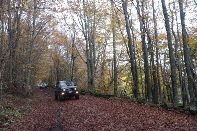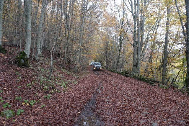 Pochi chilometri, cambiamo quota e ci infiliamo in un magnifico sterrato addobbato dai colori autunnali, il fitto manto di foglie si sposta al passaggio delle prime auto, un bosco di betulle ci fa da contorno.