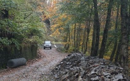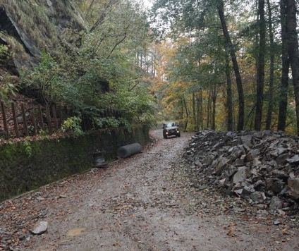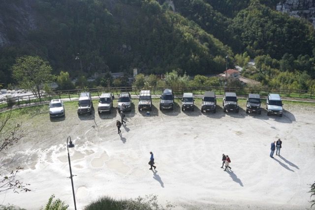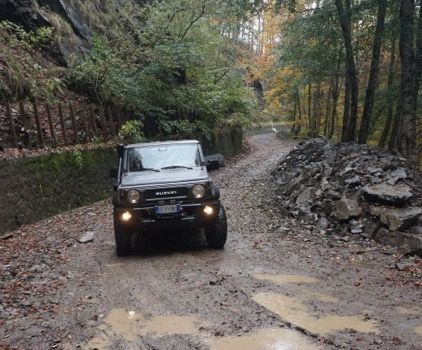 Ripartiamo, il bosco continua a riservare sempre sorprese, le recenti piogge hanno lasciato il segno, oltre a creare buche in alcuni tratti ha provveduto ad erodere i margini della strada, per fortuna nelle esplorazioni precedenti abbiamo provveduto a sistemare alcuni scoli, cosi con molta attenzione riusciamo a transitare senza grossi problemi anche nei passaggi più stretti, riusciamo a vedere sulla nostra destra il lago di Gramolazzo dall’alto, scendiamo in asfalto a Minucciano e proseguiamo sulle strade tortuose verso Equi terme, arriviamo a Gassano, dove abbiamo appuntamento con il vicesindaco per ritirare il permesso al transito di una strada boschiva, lo troviamo al bar del paese con una allegra comitiva locale, e a sorpresa ci nega il passaggio, dicendo che il terreno era troppo bagnato e non saremmo riusciti a percorrere i tratti in salita della strada nel bosco.