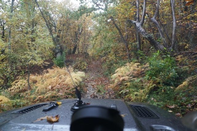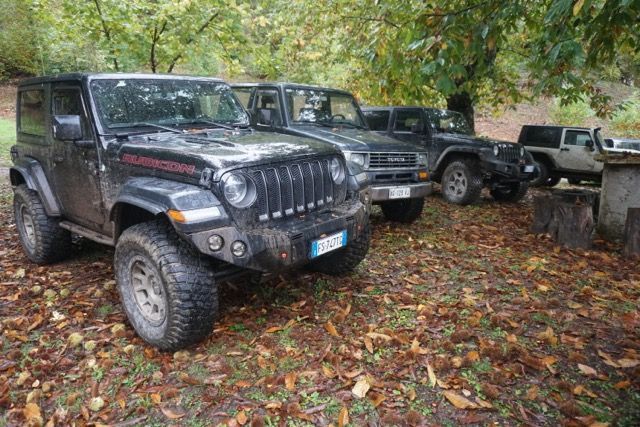 Approfittiamo della tettoia di una struttura semi abbandonata per ripararci dalla pioggia, e come per magia Flavio estrae alcune bottiglie dal frigorifero della sua Jeep e ci prepara qualche spritz, poco dopo ripartiamo e ci infiliamo in una discesa ripida e stretta, un bosco di castagni ci fa da contorno, alcuni sono secolari si nota anche la capitozzatura dei più anziani probabilmente per salvarli dalla malattia di genere che ha afflitto la specie alcuni anni fa.