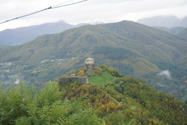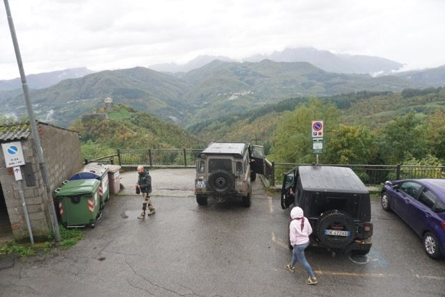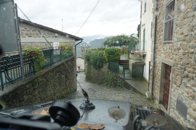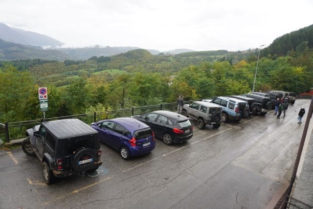 Alcuni tornanti ci costringono a fare manovra con il muso della vettura esposto verso il”baratro” ma passiamo tutti, il mio pensiero corre verso alcuni passaggi stretti e piccole variazioni di quota che sono bagnate, ma grazie alla perizia di guida e la attenzione dei partecipanti passiamo tutti, verso la fina della discesa quando la strada si allarga smette di piovere, il cielo si schiarisce e riusciamo a intravedere dall’alto la fortezza di Verrucolette, forte medievale dell’età del bronzo situato su una roccia basaltica, poi trasformato in un presidio militare dei Duchi Este, definito “inespugnabile”, passiamo l’abitato di Vibbiana, con un passaggio strettissimo nell’abitato storico, da trattenere il fiato…. Sosta nel piazzaletto per la foto di rito.