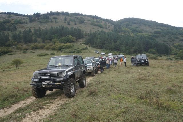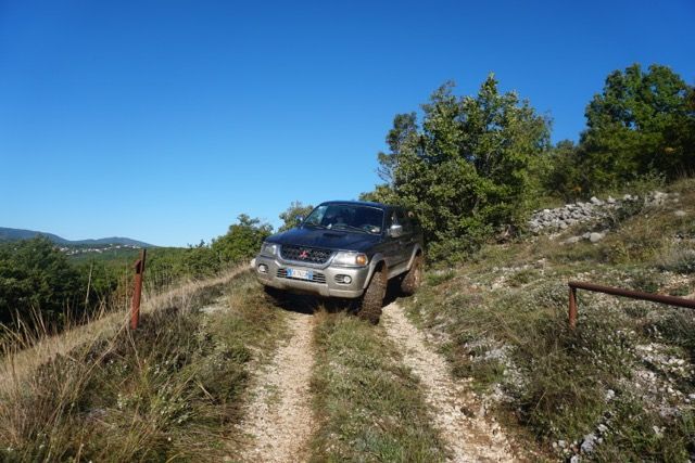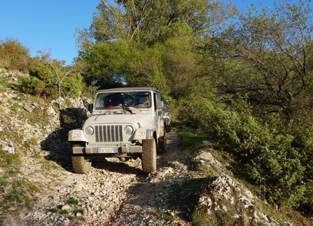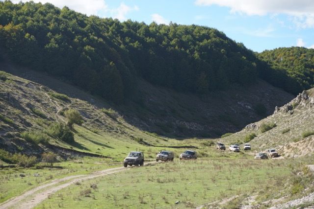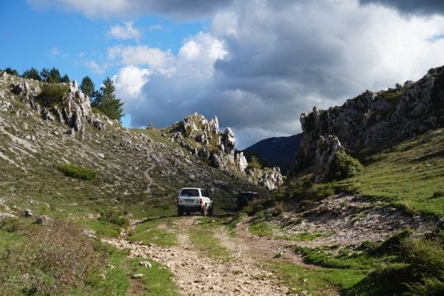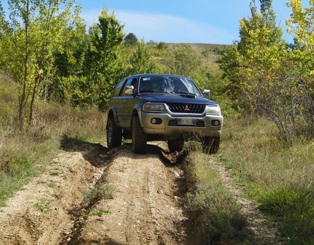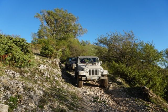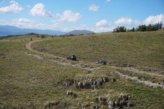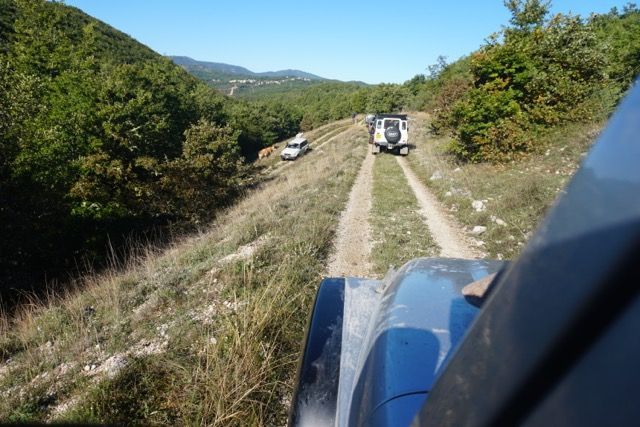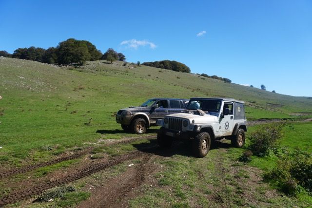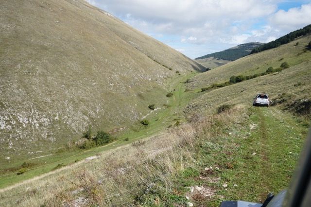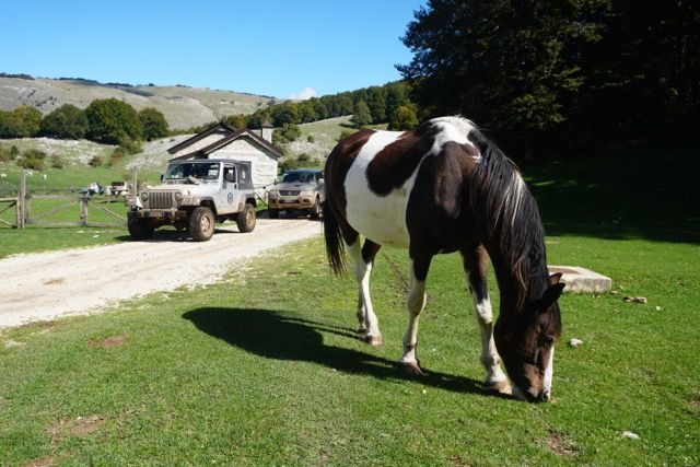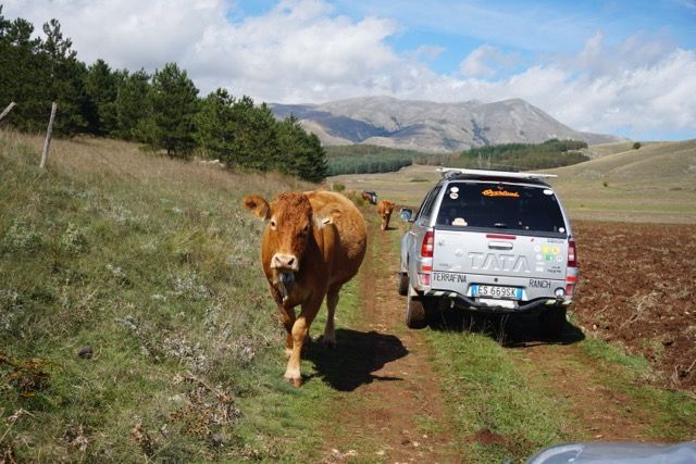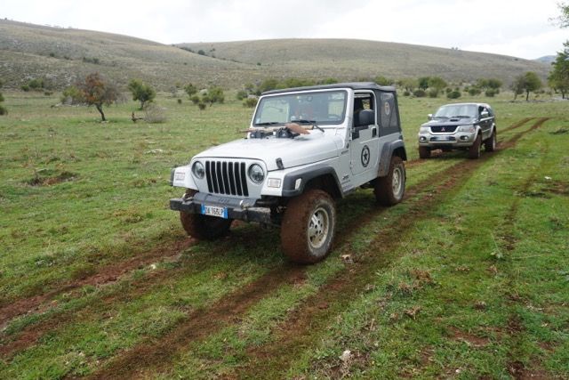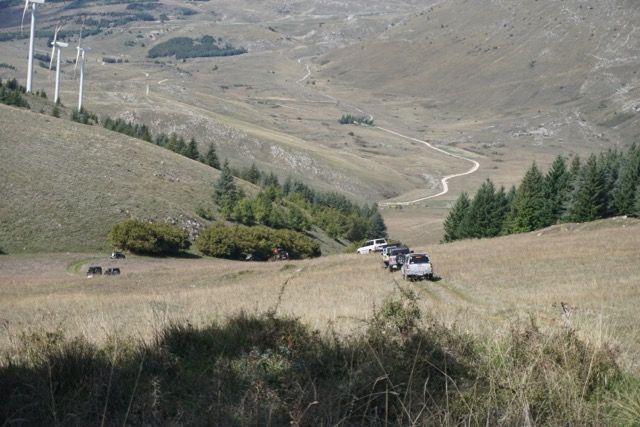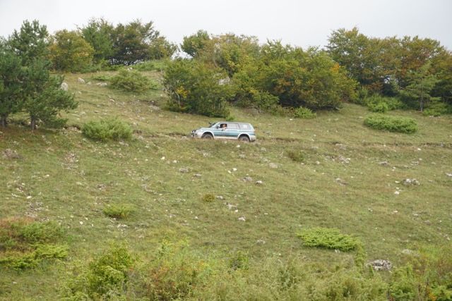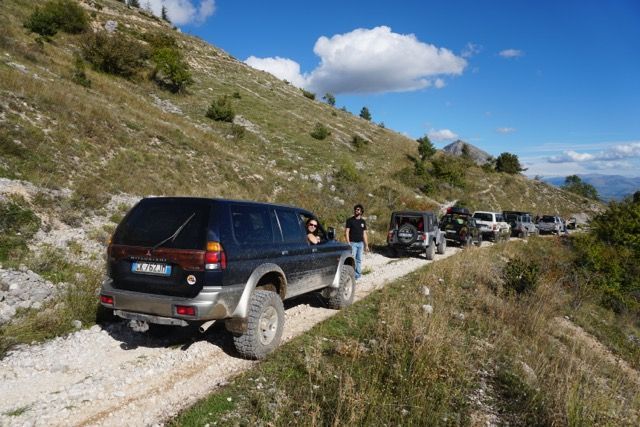 Salite, discese, sassaie, e qualche pascolo si lasciano percorrere dalla comitiva, altro piccolo momento di pioggia rende difficile la salita alla fine di un campo, qualche minuto di attesa poi tutti riesco a salire, poco dopo arrivati sulla sommità un “flash” la colonna si ferma, una foratura quasi simultanea di due auto, guarda caso le due auto montano pneumatici semi stradali, tutto questo ci ricorda che gli pneumatici con disegno stradale soffrono il passaggi nelle pietraie, gli organizzatori si adoperano per aiuta la sostituzione e successivamente contattano un gommista di un paese vicino per il ripristino.