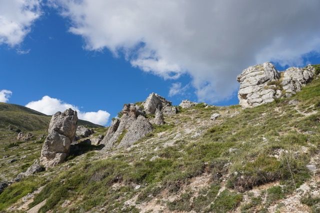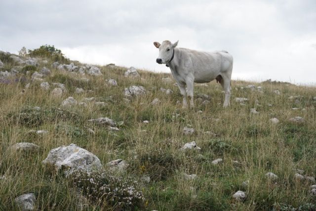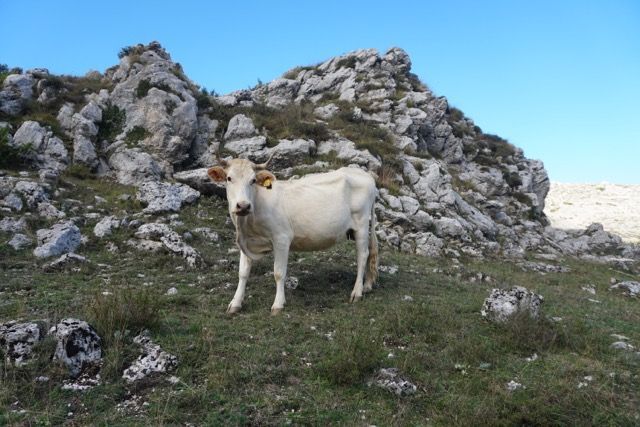Alla ripartenza attraversiamo un versante in discesa con una serpentina tra grandi massi e bovini incuriositi dal nostro passaggio, si sente molto forte l’odore delle erbe di montagna, piacevolissimo anche il colore dei fiori che spuntano tra le rocce.