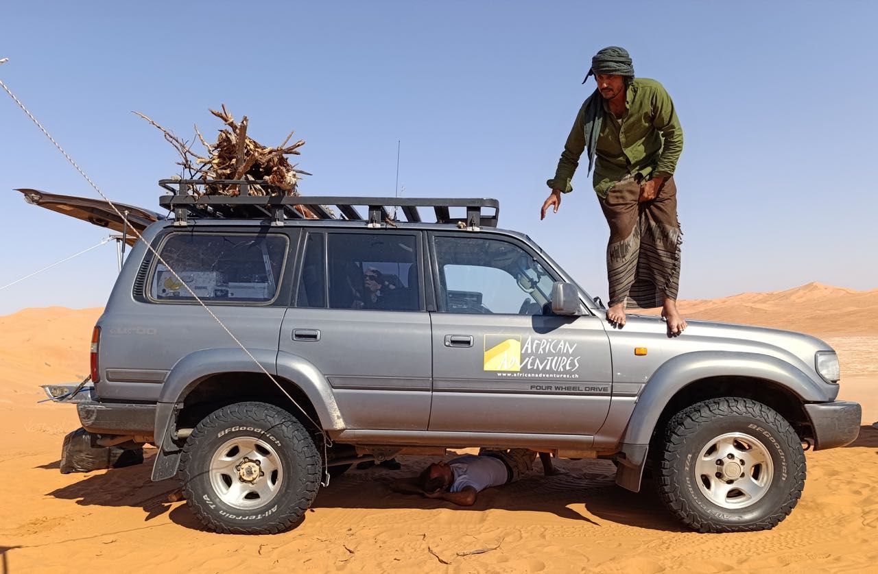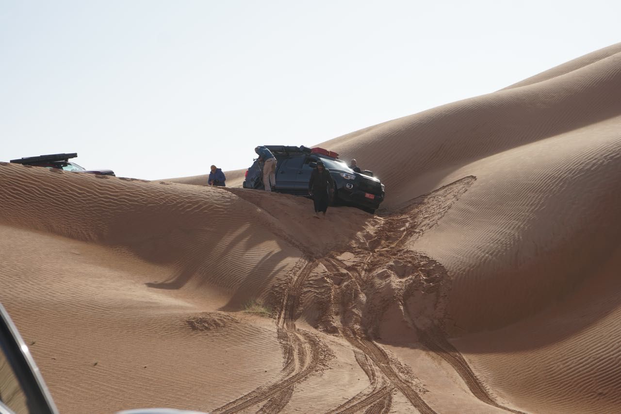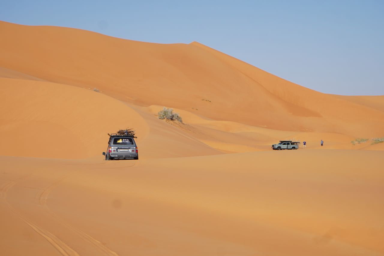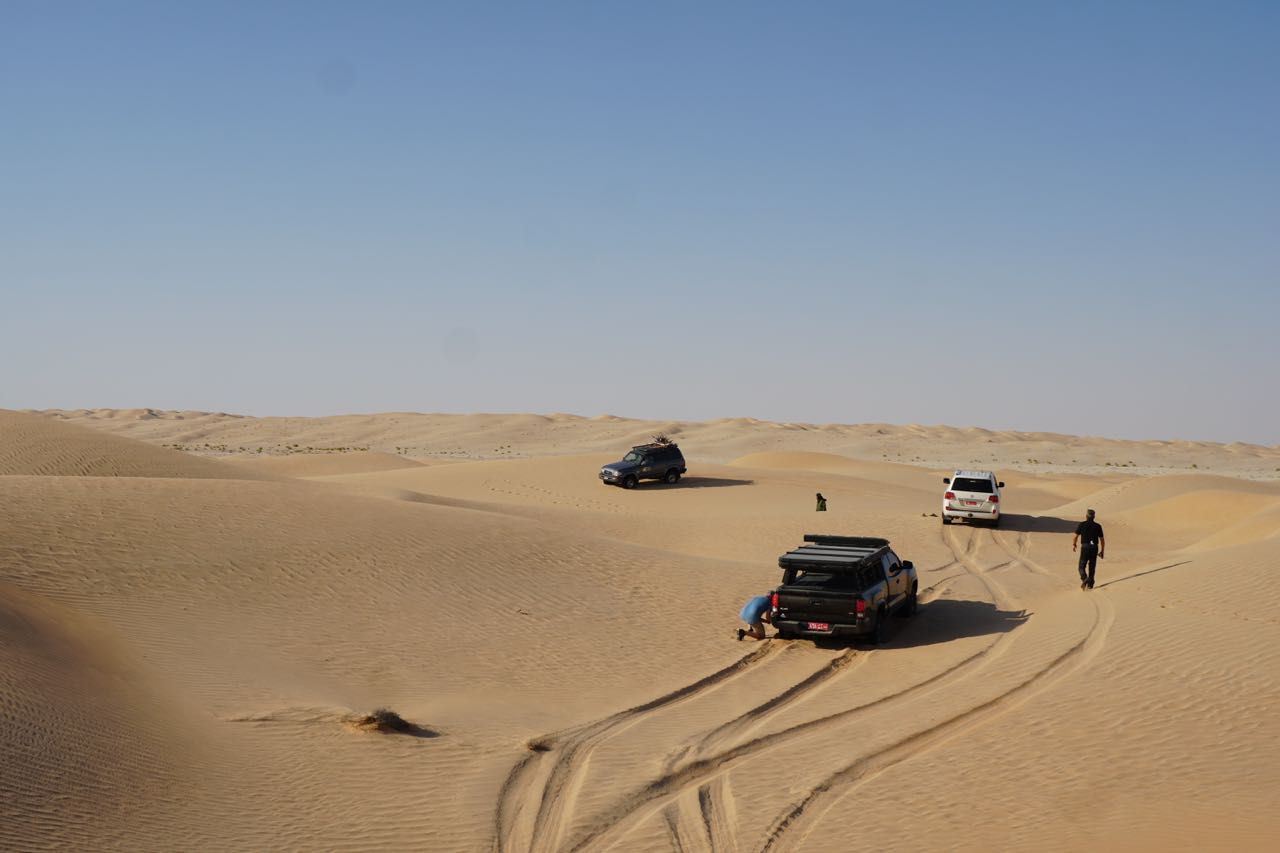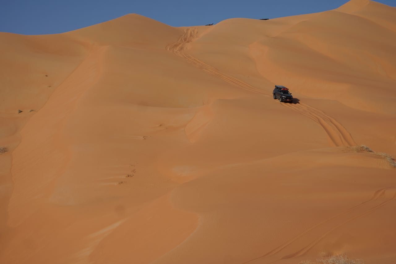 Cominciamo ad entrare nel viaggio della nostra immaginazione,alcune lingue di sabbia sulla strada, piccole dune all’orizzonte, proseguiamo in convoglio sul tappeto ondulato di sabbia guardando il panorama desertico che persa la vegetazione si trasforma in salite e discese tra le dune, i colori sono mutevoli, ogni curva cambia l’inclinazione della luce e le due cambiano colore ,la guida diventa impegnativa,da qui comincia la solita manfrina … 4ruote motrici, ridotte, si , no, alcune carenze tecniche o malcostumi favoriscono situazioni imbarazzanti risolvibili con qualche traino.