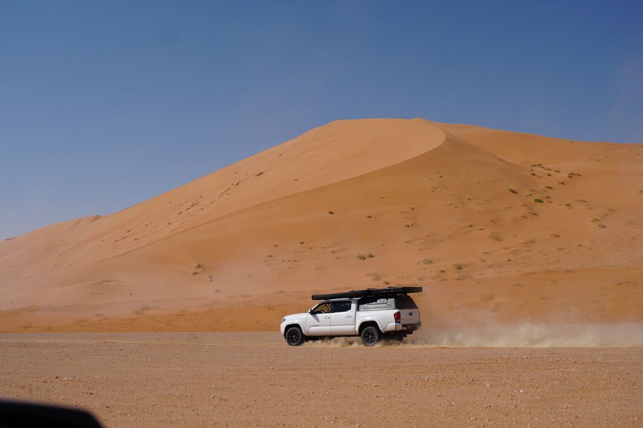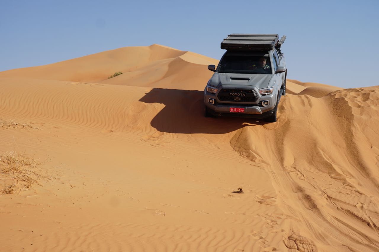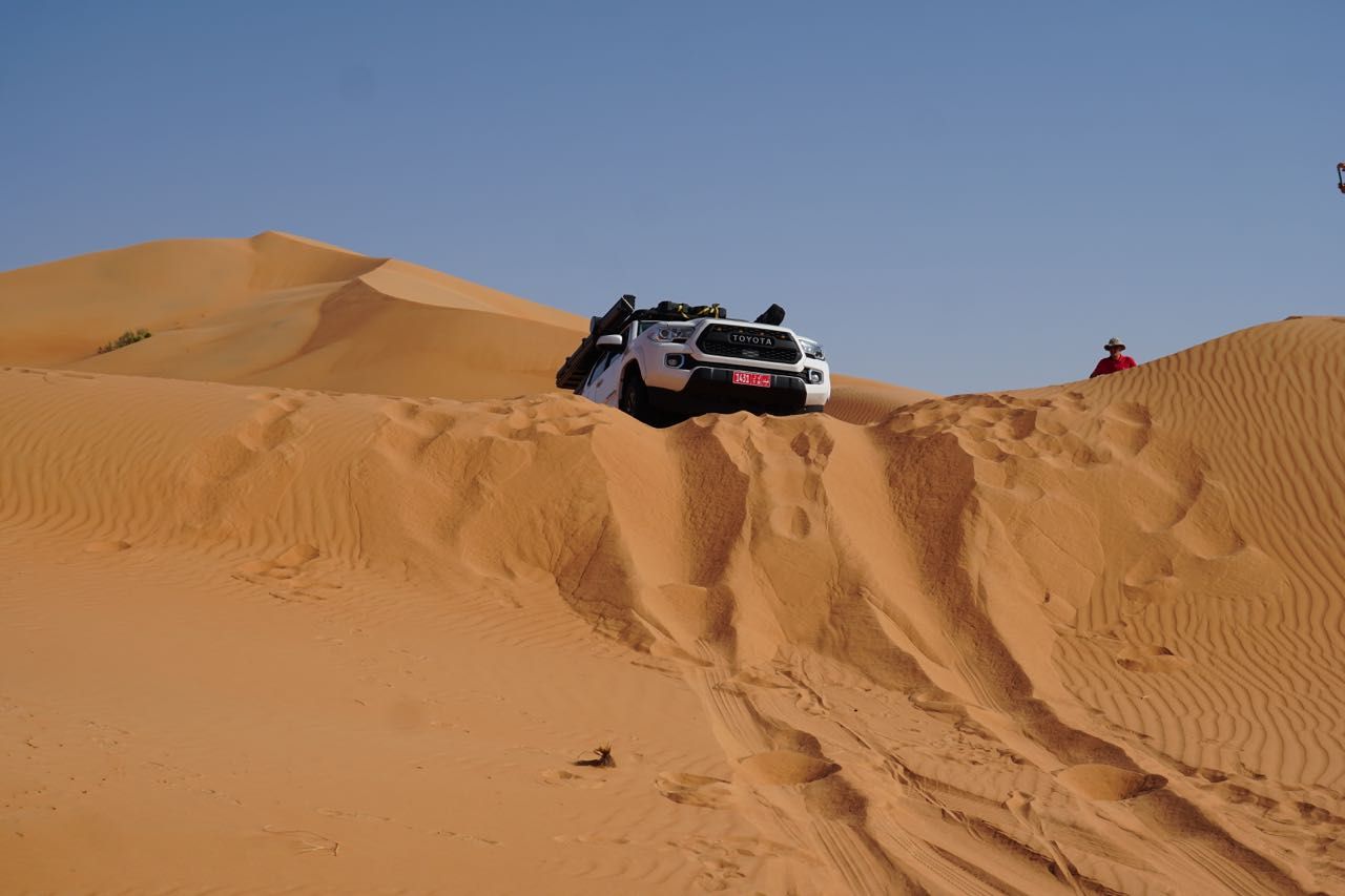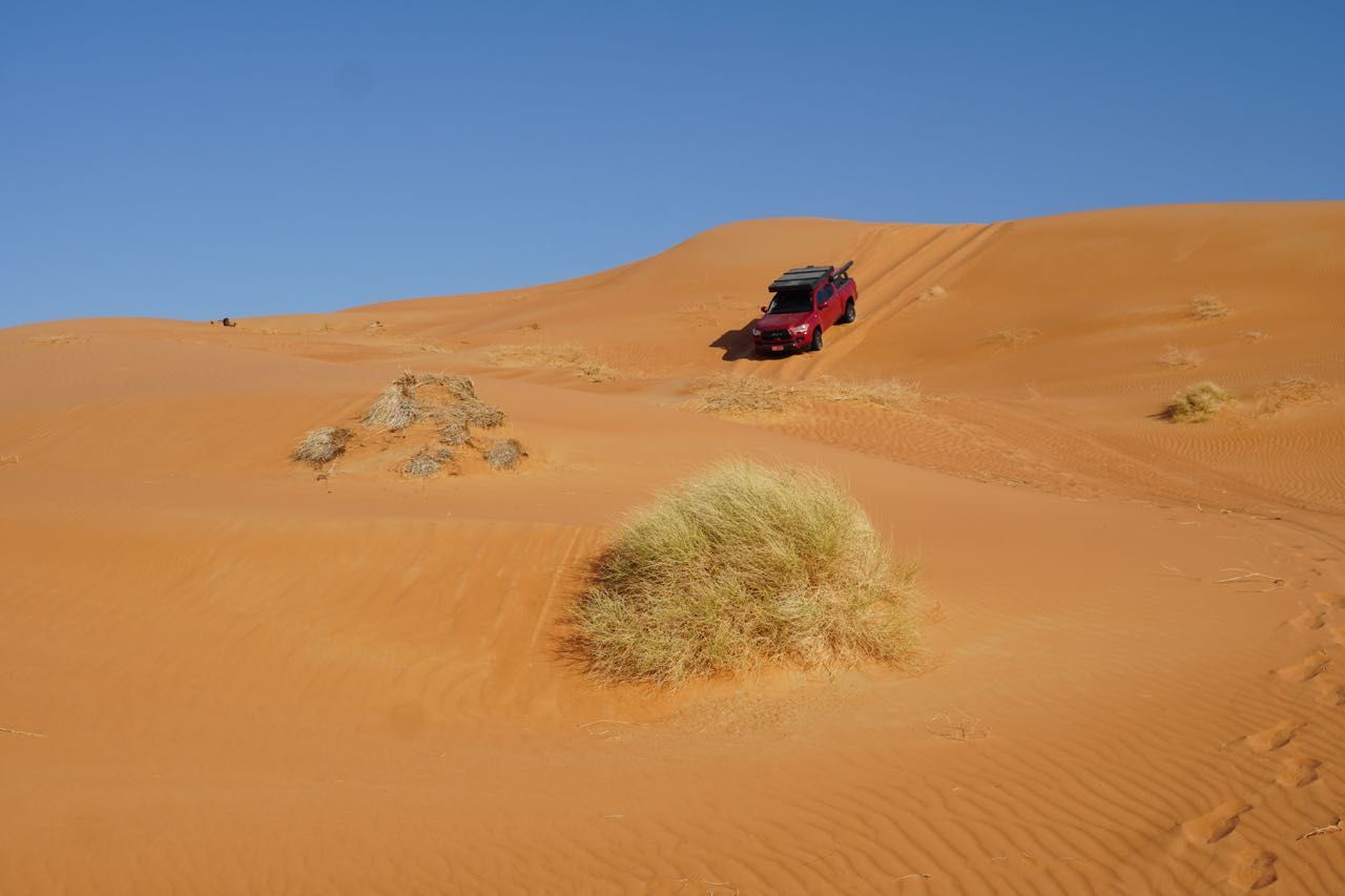 Avanzando vediamo delle montagne di sabbia che sembrava giallo paglierino poi gialla poi con il calar del sole rossa, ma sono altissime, superiamo le prime, ne aggiriamo alcune, questo sarà il panorama dei prossimi giorni, qualche leggero affossamento dovuto principalmente alla mancanza di confidenza con i nostri magnifici Tacoma.