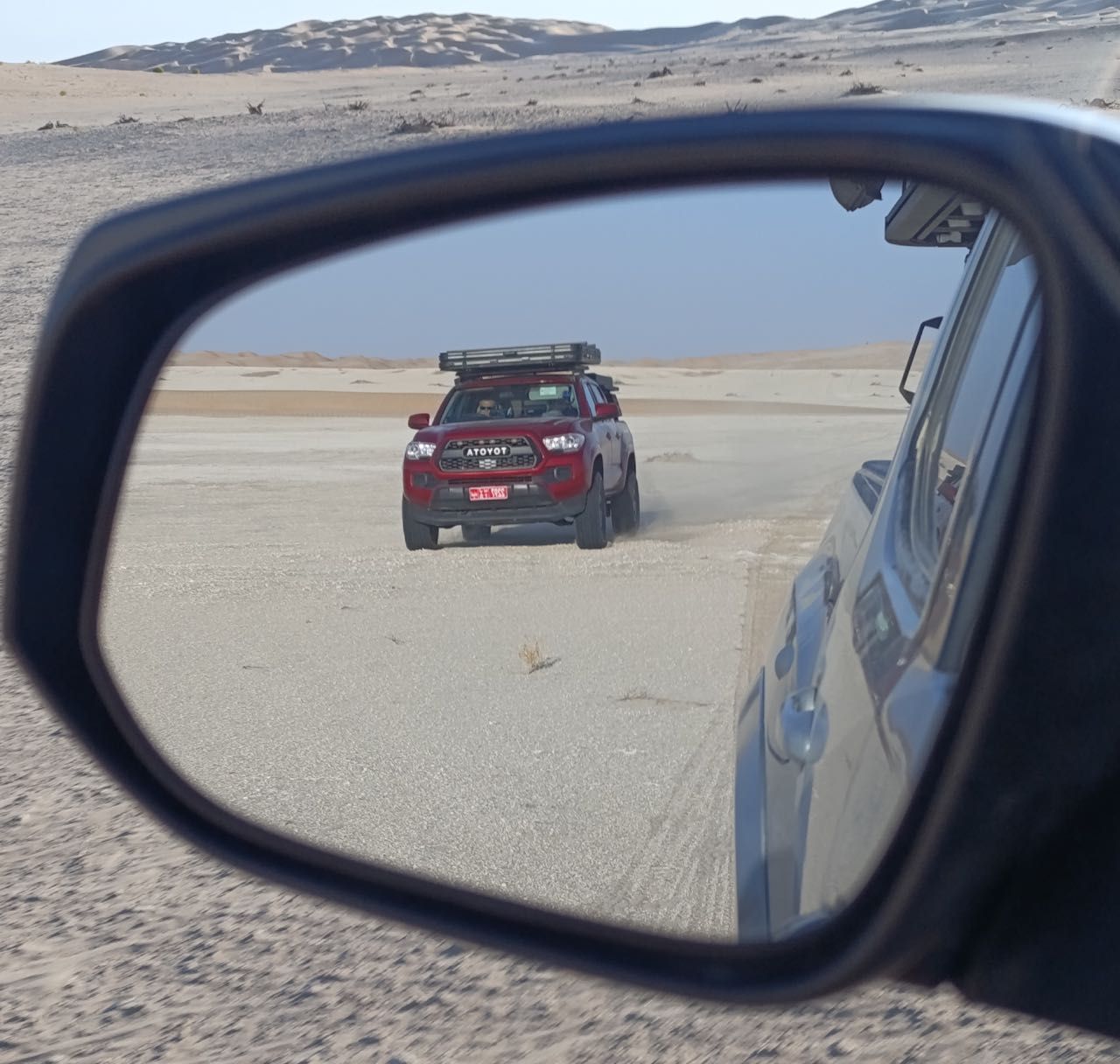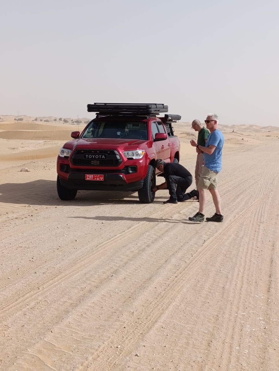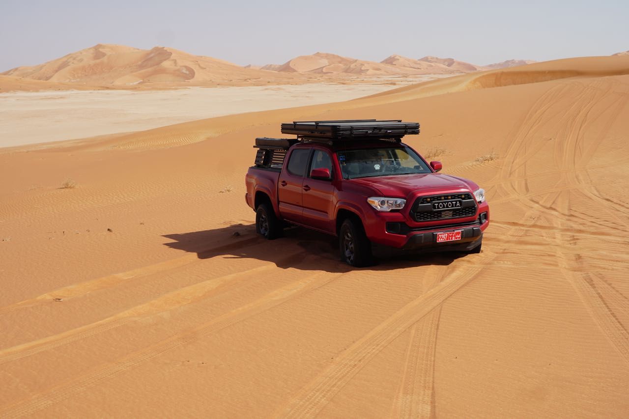 Avanzando vediamo delle montagne di sabbia che sembrava giallo paglierino poi gialla poi con il calar del sole rossa, ma sono altissime, superiamo le prime, ne aggiriamo alcune, questo sarà il panorama dei prossimi giorni, qualche leggero affossamento dovuto principalmente alla mancanza di confidenza con i nostri magnifici Tacoma.