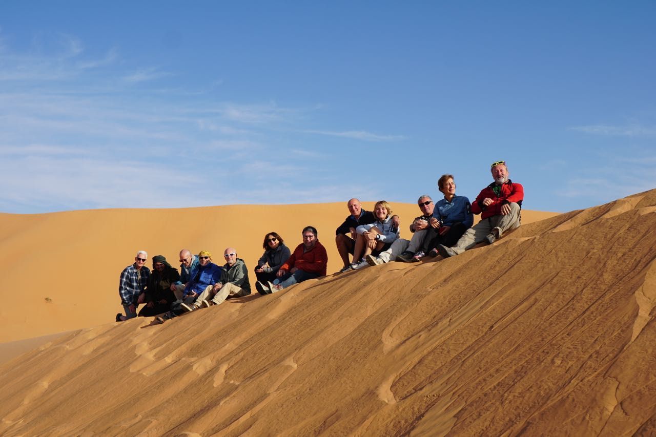 Arrivati sulla cima ammiriamo con stupore la conformazione geologica dell’orizzonte, alte montagne di sabbia con davanti pianori con un colore bianco sale, qualcuno dice che sono laghetti prosciugati altri che concrezioni di gesso affiorate nelle ere passate, questo è quello che vedremo e percorreremo nei prossimi giorni, comunque fantastico e inusuale anche per esperti sahariani.