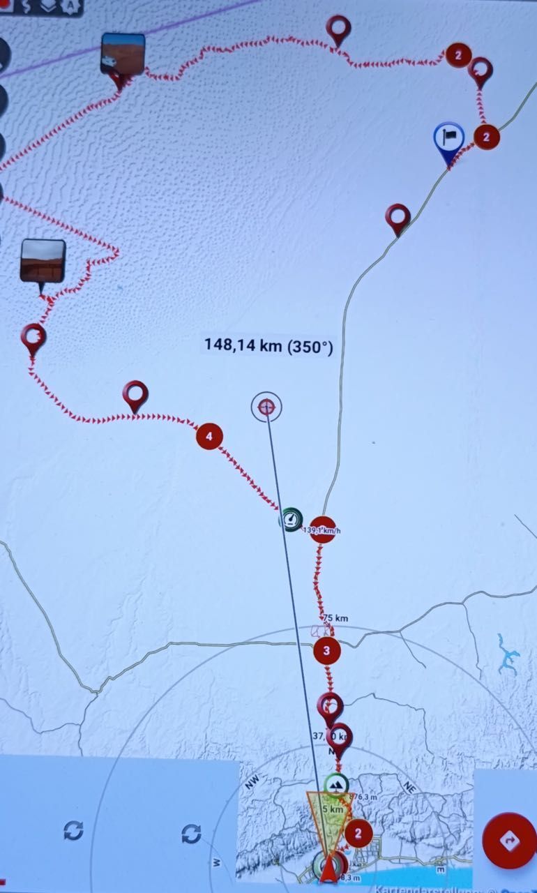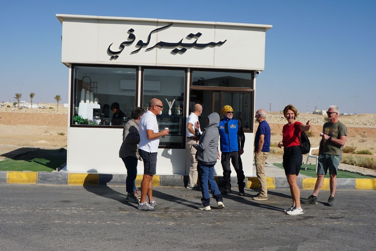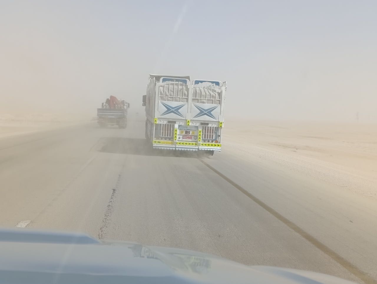 Si Parte… si sale sull’altopiano con una strada a 4 corsie, dopo un centinaio di chilometri il meteo che fino allora era tranquillo, una giornata soleggiata, si trasforma , un forte vento solleva la sabbia limitando la visibilità anche se alcuni autocarri che ci precedono non adeguano il loro stile di guida, si sorpassano a vicenda, prima tappa al distributore di benzina e supermercato, riempiamo al massimo il serbatoio e le taniche, riempiamo le auto con i boccioni dell’acqua minerale, integriamo le scorte alimentari.