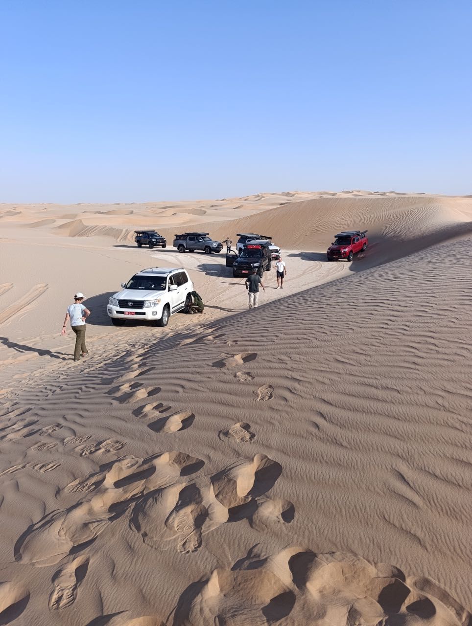 Le dune grandi si susseguono, i pianori bianchi pure, siamo distanti la colonna si sviluppa per due chilometri, nei piani si vede la polvere sollevata da chi ci precede, come nei film, sui passaggi dunari siamo più vicini per intervenire in caso di problemi e per non perdere la traccia, il gruppo è coeso e collaborativo, ma anche ciarliero, c è chi con le battute e spiritosaggini riesce a trasformare una insabbiata tragica in un momento comico.
